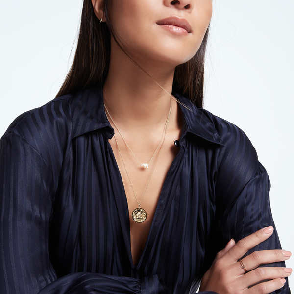 Jennifer meyer good luck charm necklace. 18kt yellow gold charm on 14kt yellow gold chain. These included hammered gold hoop earrrings and the Good Luck Charm pendant necklace. 14K and 18K yellow gold Jennifer Meyer beaded necklace featuring good luck pendant with 002 carats of round brilliant diamonds with spring ring closure.