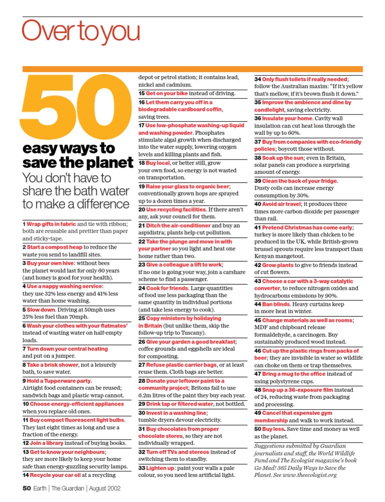 50 ways to save the earth. Rebecca answers those questions in 50 Ways to Help Save the Earth. An environmentally-responsible home not only saves you money but saves the earth too. Save to save the planet Save.