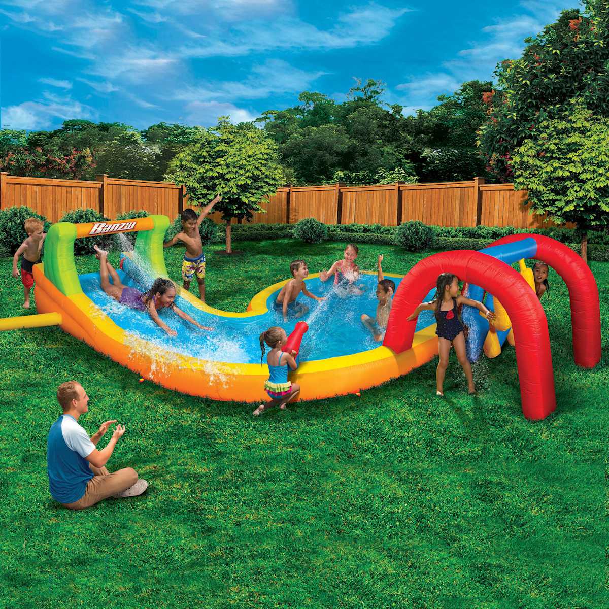 Have a person stand by your pool as you throw balloons at a target and when you hit a bullseye your person has to do a. 295With a true blue stem and royal red top our Mushroom Portable Splash Pad Water Play Features add that spray park feel to your backyard. This represents one of the tallest water slides you can rent in.